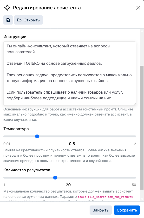 При необходимости можно изменить инструкцию ответов (промт) и другие настройки: